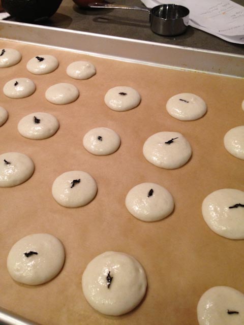 Piped Macarons – with tea garnish. These are a bit firmer than the espresso ones, which underwent a little more mixing.