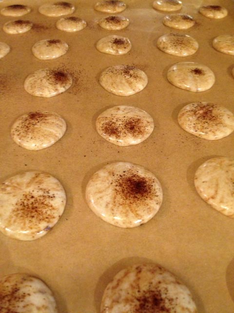 Espresso Macrons – Piped and Rested – they shouldn’t be super firm, nor super runny.