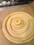- Next to the puff pastry, pipe a spiral of pate-a-choux – one that will fit on your circle of puff pastry later. (note, I did this on the puff pastry, but it left the middle too heavy – and not as puffy, next time I will bake it separately and stick it on with caramel).