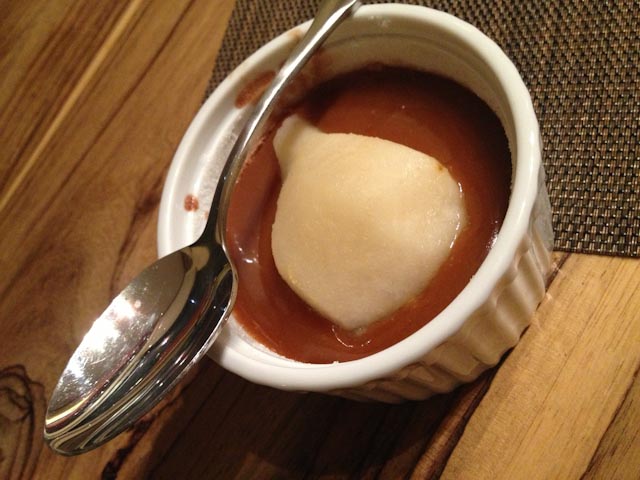 ← chocolate pots de crème with poached pear, olive oil, caramel