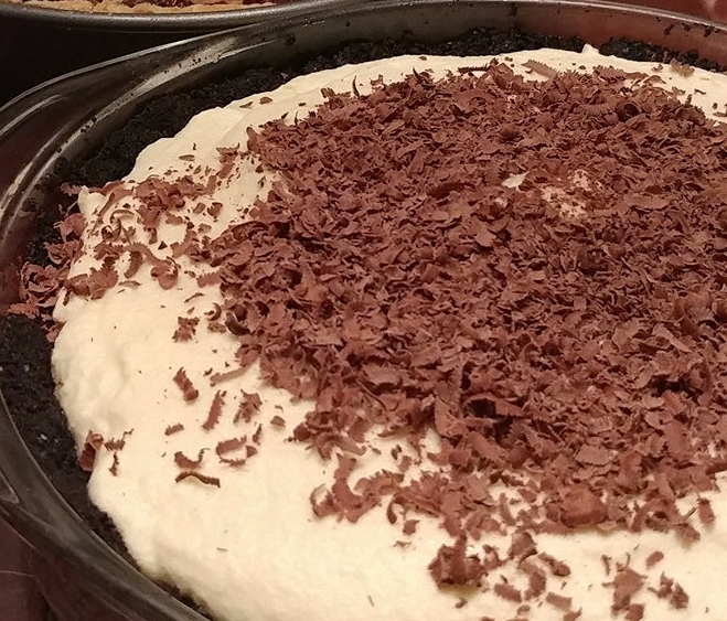 - Put the fluffy custard mixture into the pie crust, and chill for a couple hours, till it’s set.
