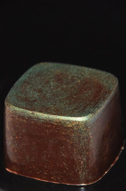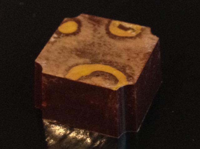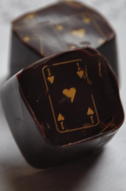 Champagne Truffles – Made with dark Valrhona chocolate, cognac, carbonated crystals. This also has a bit of a crunch and fizz (if you savor it). These also have a hand painted transfer sheet topping – with bubbles and gold disco dust.